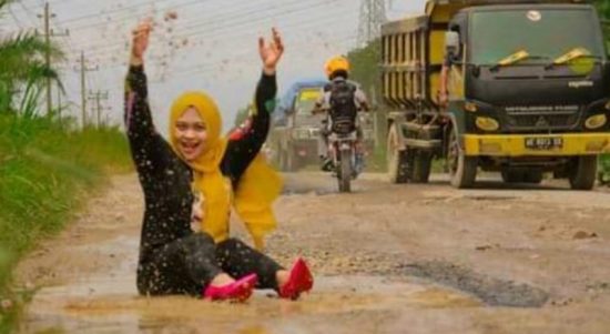 Sindir Kerusakan Jalan, Emak-emak Ini Berpose Bak Model di Kubangan