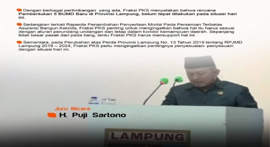 VoxLampung.com, Bandar Lampung – Fraksi PKS Dewan Perwakilan Rakyat Daerah (DPRD) Lampung meminta pembentukan BUMD Provinsi Lampung ditunda, mengingat saat ini masih